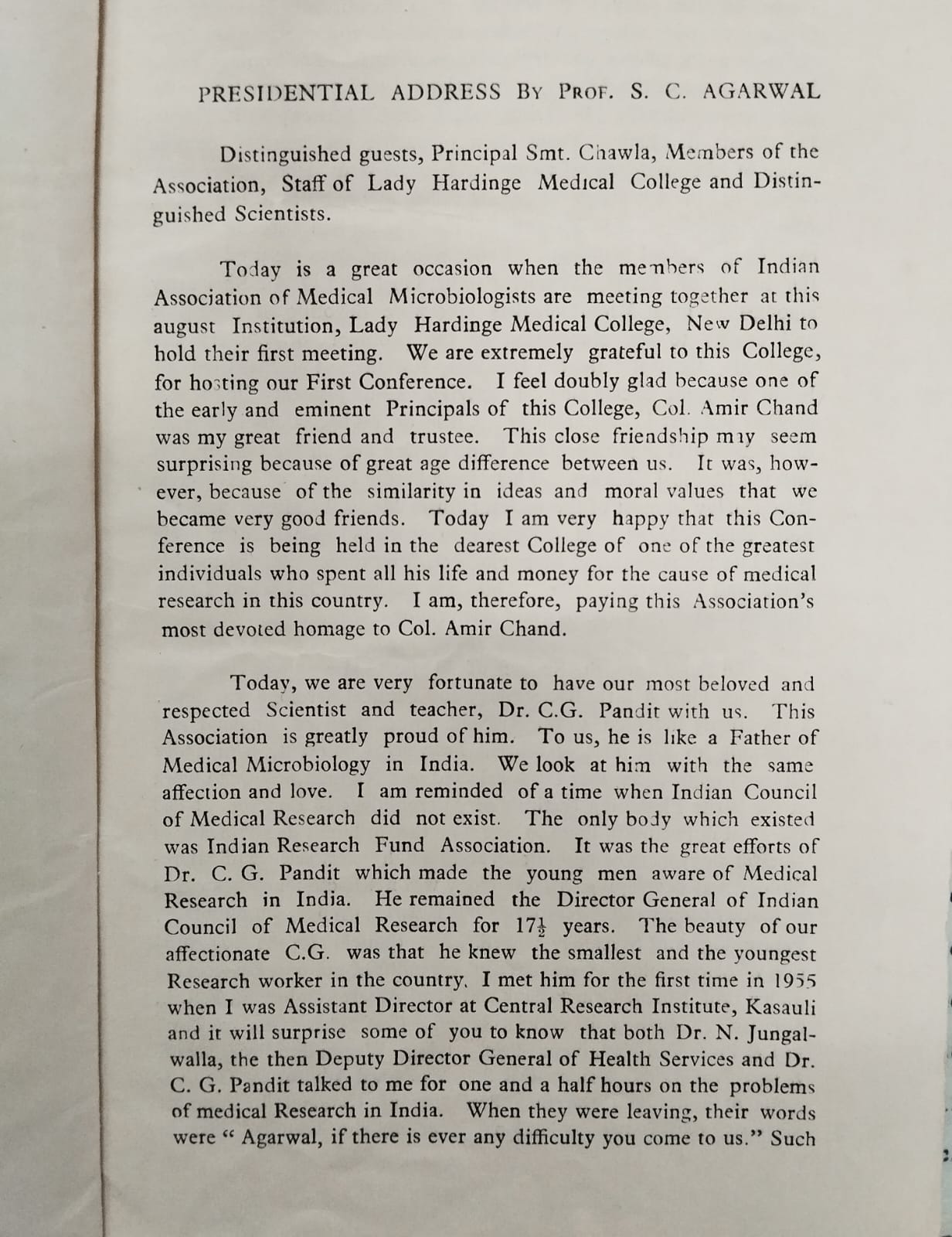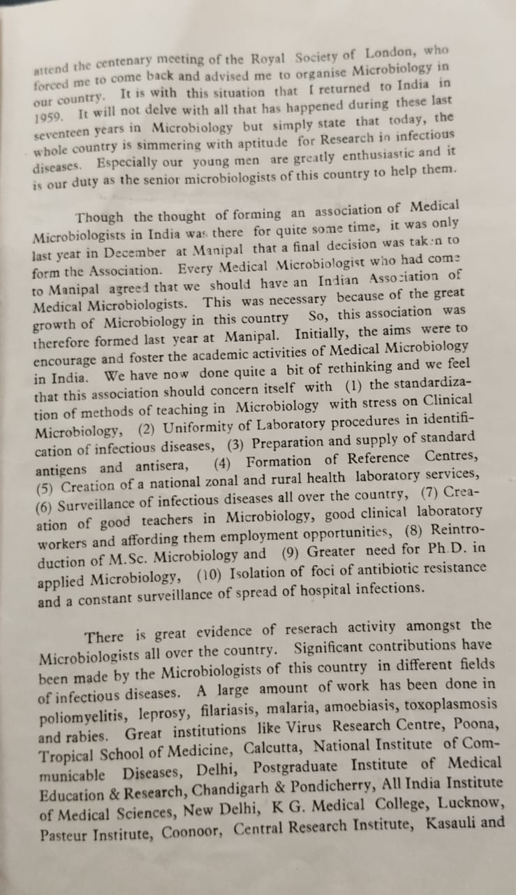 Considering the fast development of the subject in the recent years, as well as the growing number of specialists in the field, it was felt that the time was ripe to establish our own Association to improve the status of the subject of Medical Microbiology as well as medical microbiologists in our country. Thus it was decided at Kasturba Medical College to start our own Association and nominate Dr. S.C. Agarwal, Dr. K.B. Sharma and Dr. Shriniwas as three chief architects to undertake the responsibilities to put the foundation for the new organization.